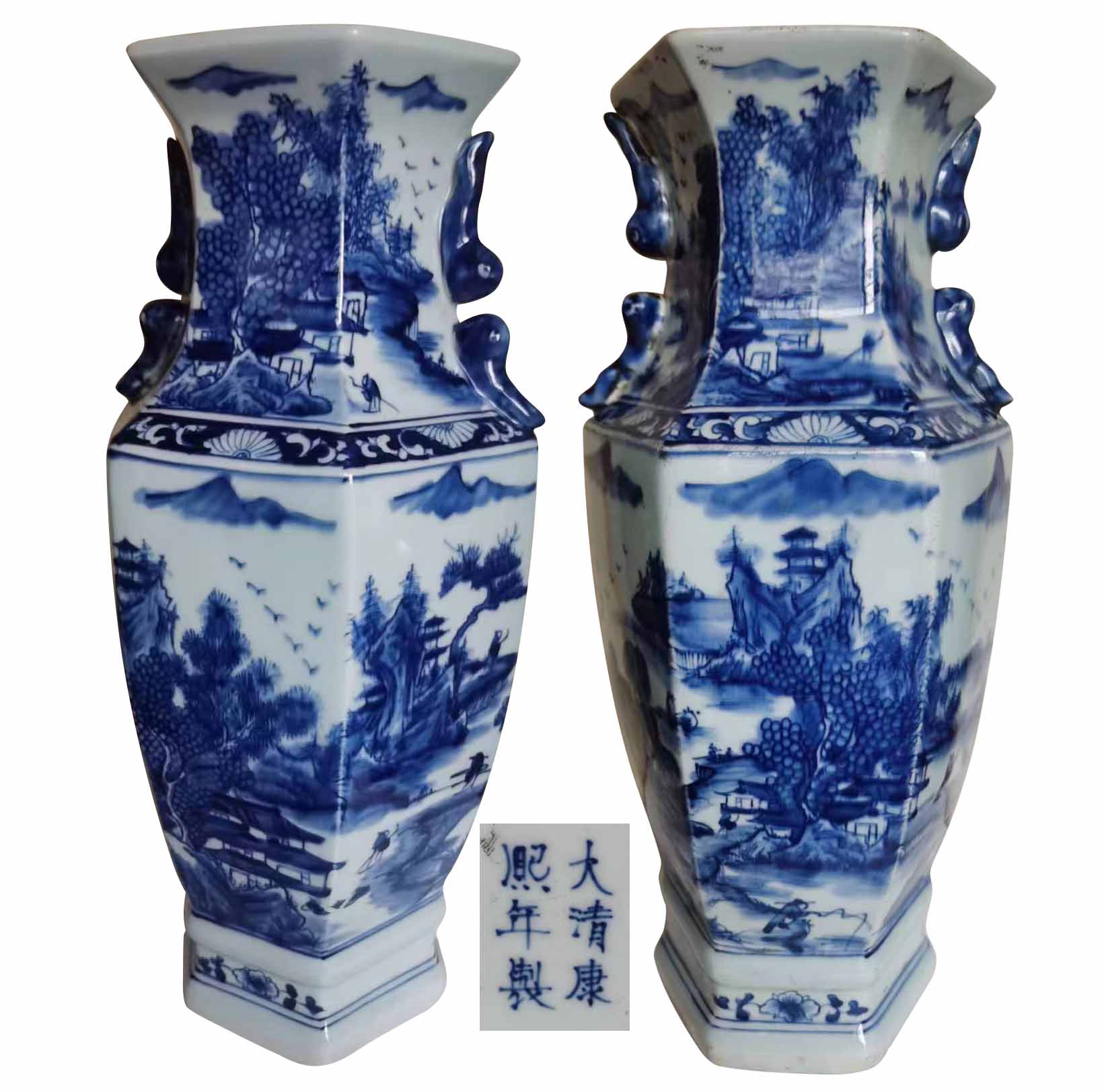 大清康熙年制青花六棱赏瓶一对