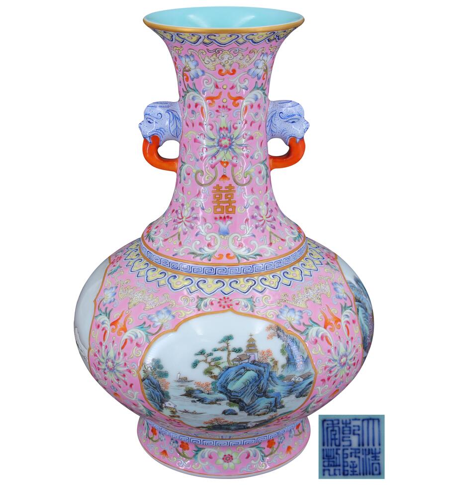 大清乾隆年制款粉彩花卉开光双耳赏瓶