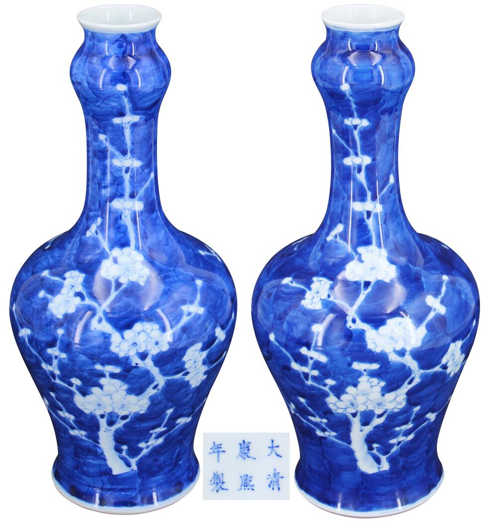 大清康熙年制款冰梅纹蒜头瓶一对