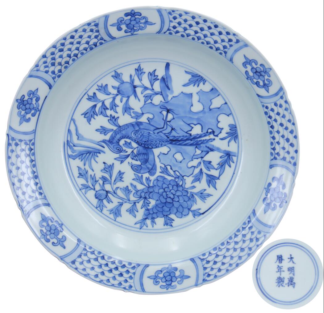 大明万历年制款青花花鸟纹葵口赏盘