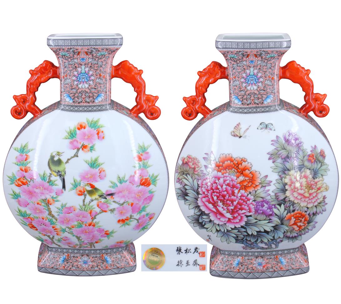 张松茂 徐亚凤款《牡丹桃花》抱月瓶