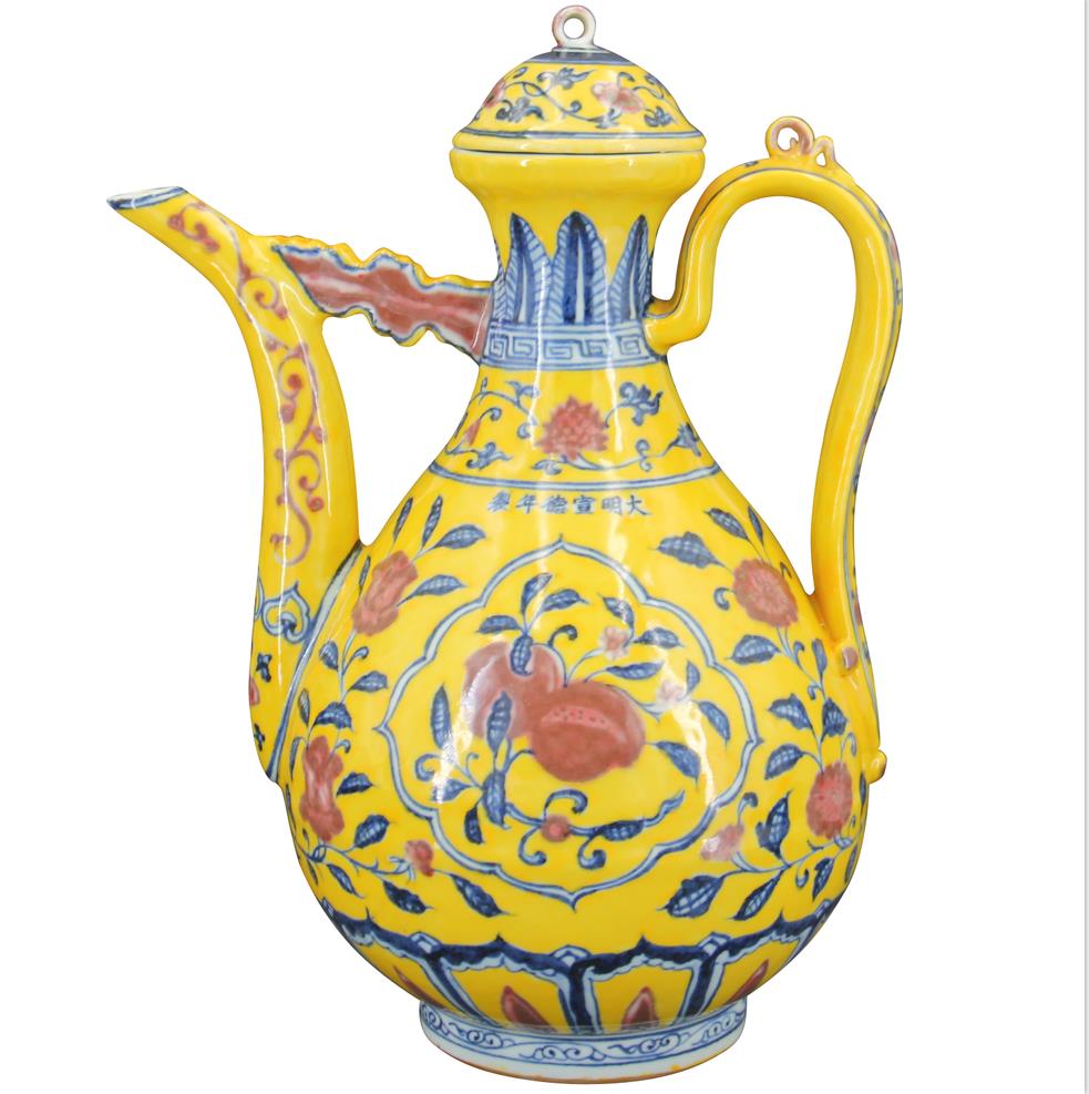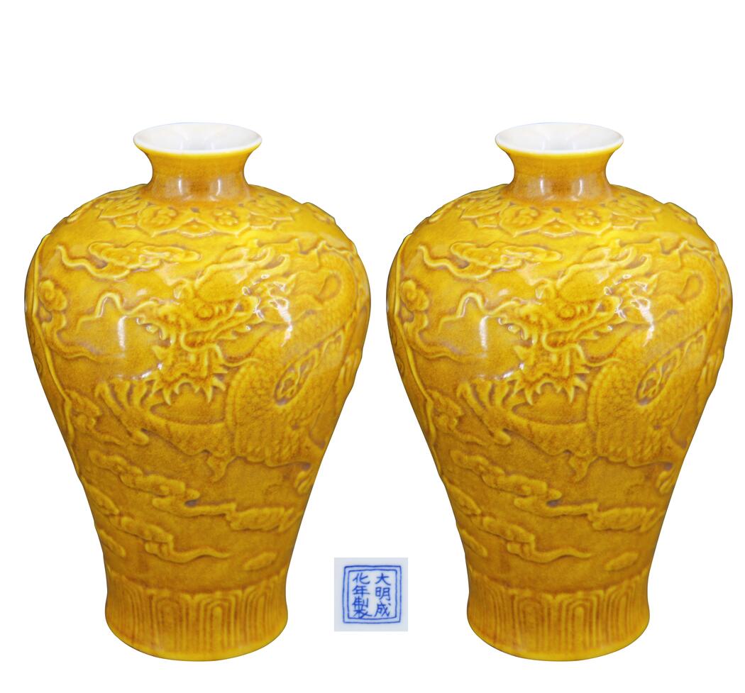 大明成化年制款黄釉龙纹梅瓶(一对)
