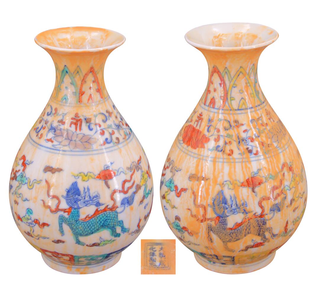 大明成化年制款斗彩麒麟玉壶春瓶(一对)