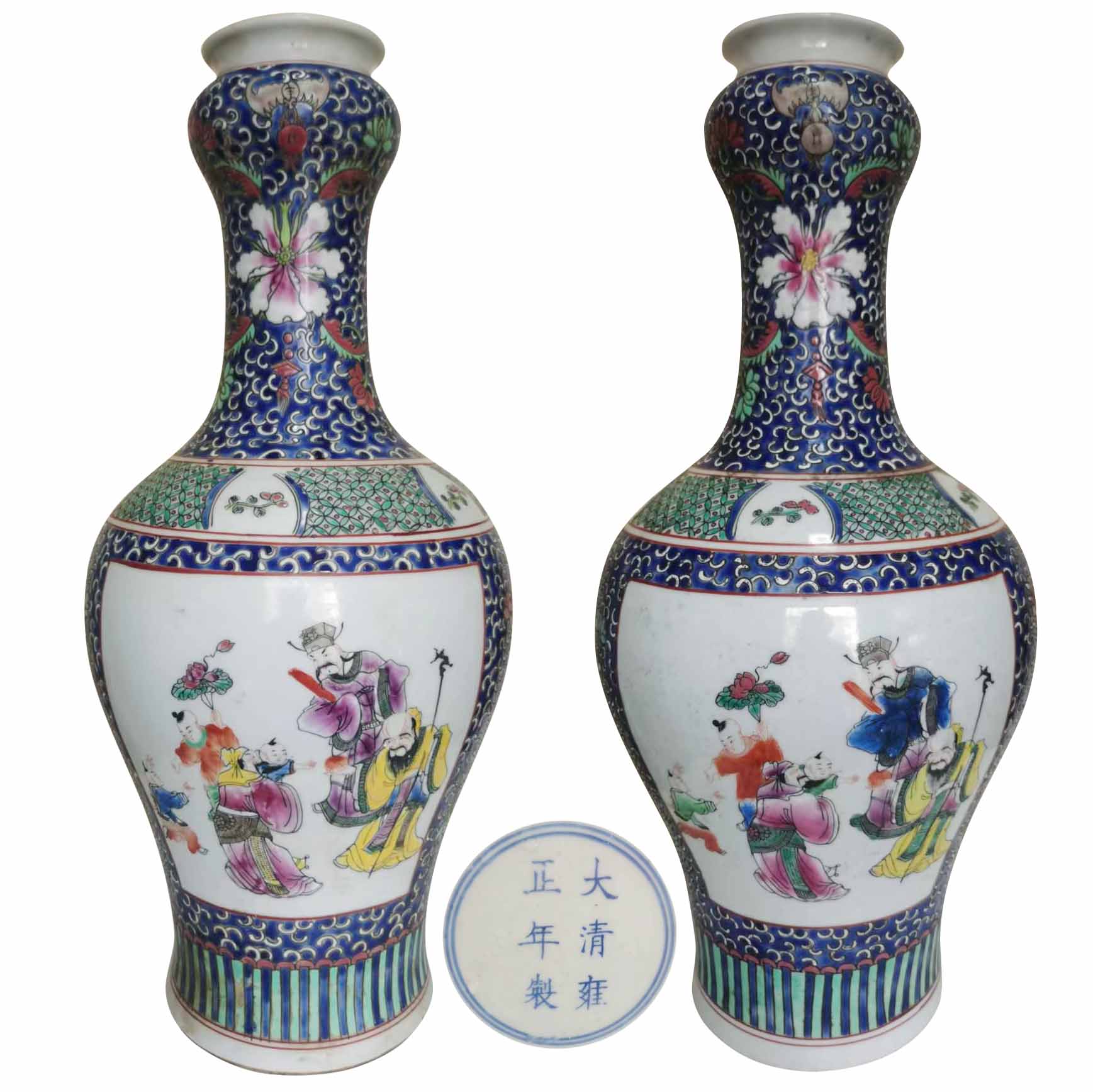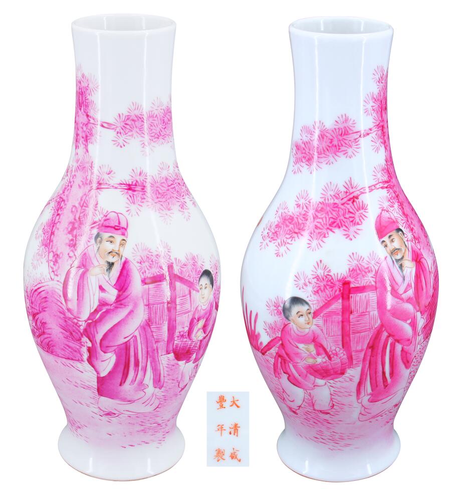 大清咸丰年制款胭脂地人物故事橄榄瓶一对