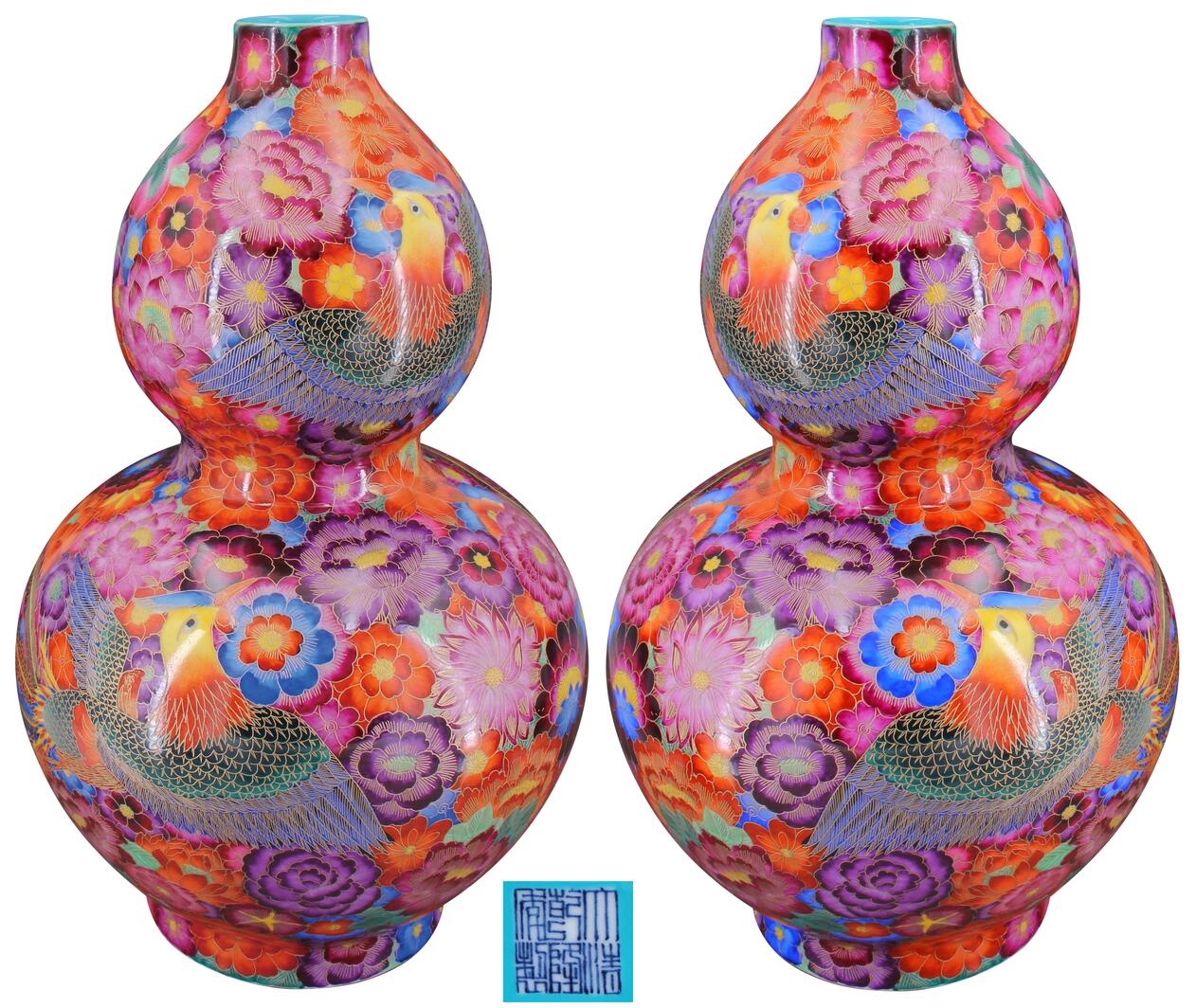 大清乾隆年制款百花不落地描金凤纹葫芦瓶
