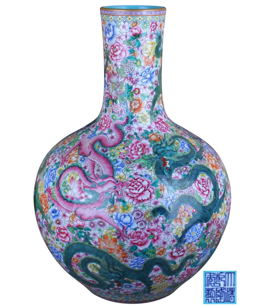 大清乾隆年制九龙百花不落地天球瓶