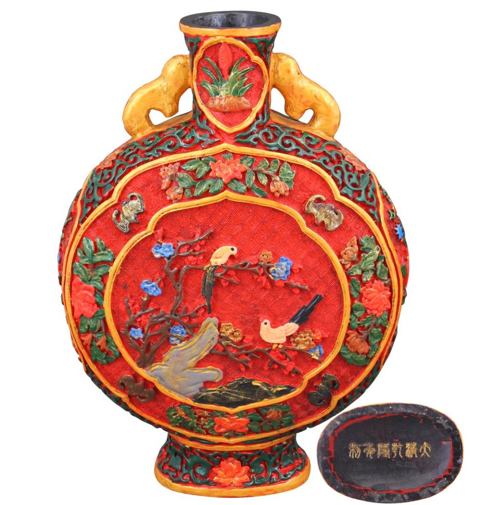 大清乾隆年制款漆器开光花鸟纹双螭耳鎏金抱月赏瓶
