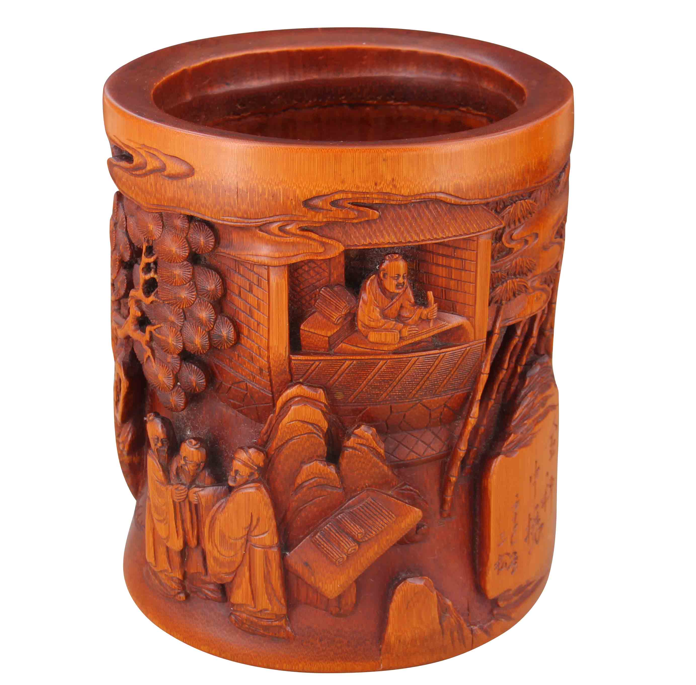 三松竹雕人物故事笔筒